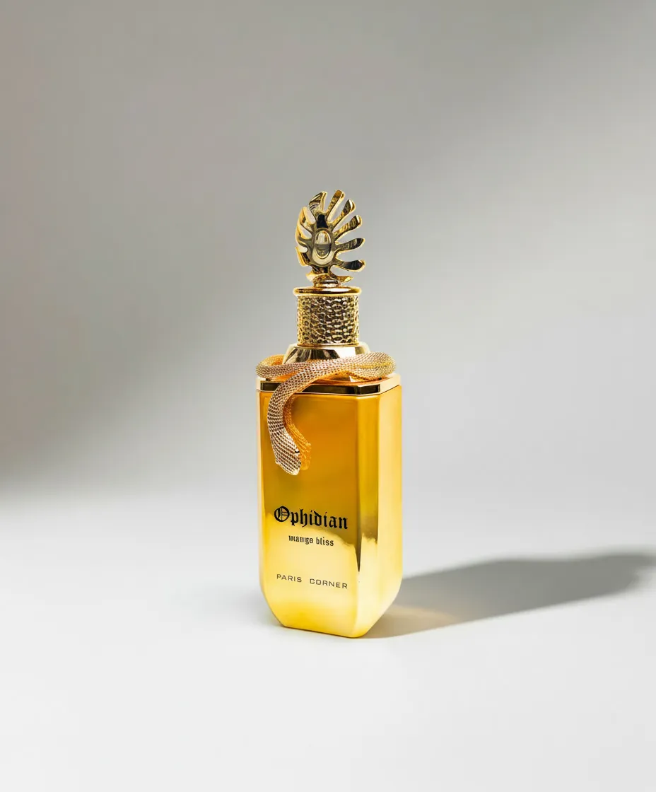 Ophidian Mango Bliss was launched in 2024. Top notes are Mango, Lemon, Ginger and Red Berries; middle notes are Jasmine, Woody Notes and Coumarin; base notes are Musk, Agarwood, Amber, Oud and Cypriol Oil or Nagarmotha.