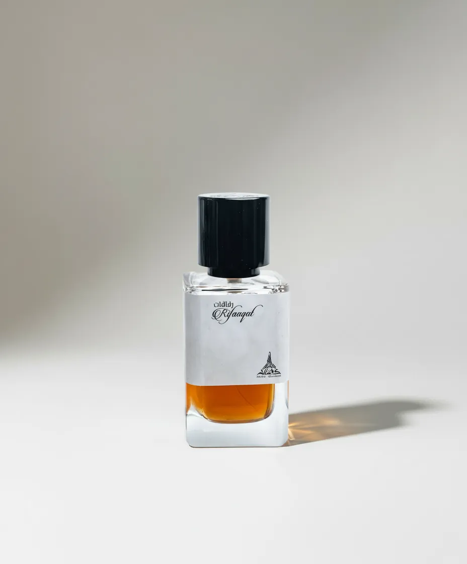 Rifaaqat was launched in 2023. Top notes are Black Pepper, elemi and Pink Pepper; middle notes are Olibanum and Saffron; base notes are Vanilla and Cedarwood.